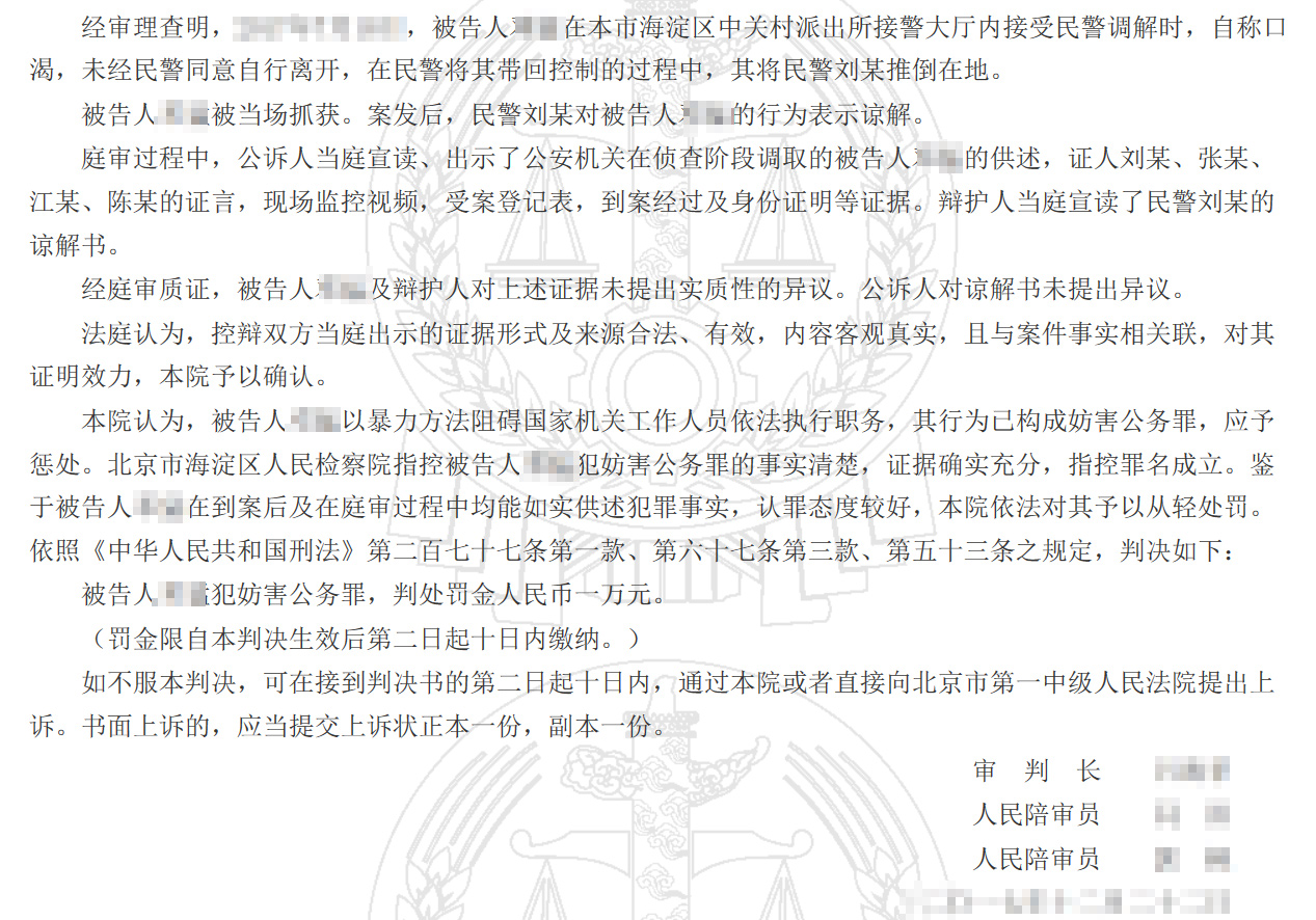 王某涉嫌妨害公务被海淀公安分局刑拘,经北京市国韬律师事务所李在珂律师团队胡娟律师成功辩护,办案机关决定变更其强制措施,取保候审处理。最后被海淀法院判决单处罚金一万元。注:为保护案件当事人的个人隐私及涉及国家机密案件、有伤社会风化及其它不宜公开的案件,我们特对案件当事人的姓名、籍贯、住址、单位名称等做了隐藏技术处理,并只公布了判决文书的首页(显示李在珂律师团队是本案辩护律师)、尾页(显示判决结果),以证明李在珂律师团队所辩护的成功案例的真实性!特此说明!