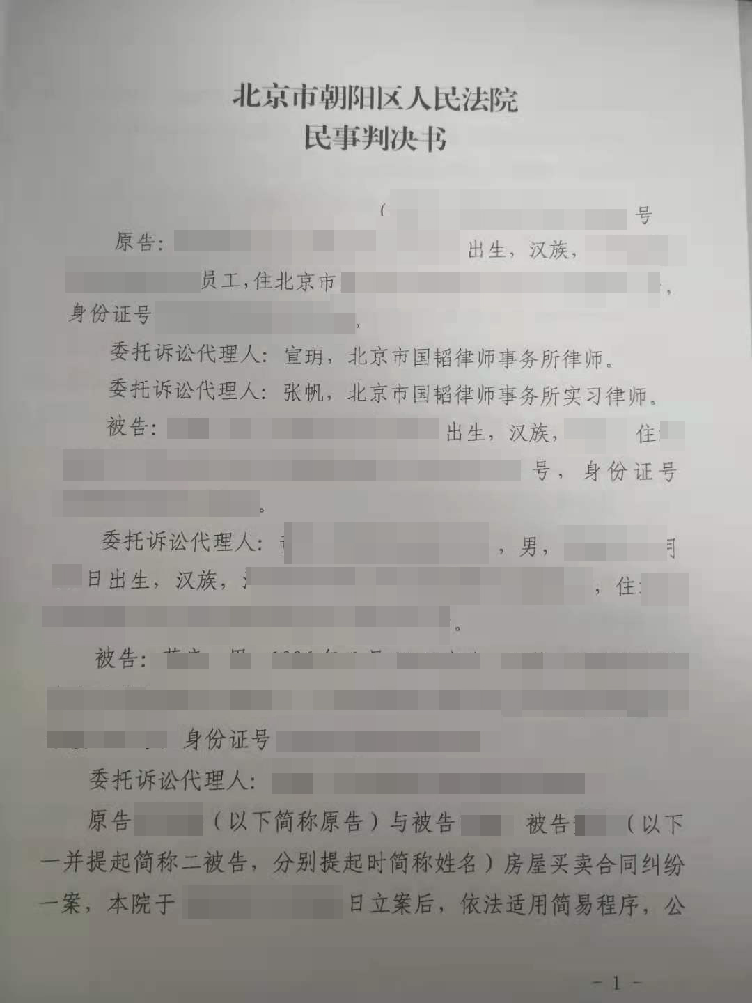 李某与王某和杨某签订了房屋买卖合同,当时约定王某和杨某在房产过户后五年内迁出户口,结果王某和杨某并未按期将户口迁出。经北京市国韬律师事务所宣玥律师和张帆律师提供法律帮助,北京市朝阳区人民法院判决三个月逾期时间赔偿违约金两万元。之后若对方仍不迁出户口可另案起诉继续索赔。注:为保护案件当事人的个人隐私及涉及国家机密案件、有伤社会风化及其它不宜公开的案件,我们特对案件当事人的姓名、籍贯、住址、单位名称等做了隐藏技术处理,并只公布了判决文书的首页(显示国韬律师团队律师是本案辩护律师)、尾页(显示判决结果),以证明国韬律师团队律师辩护的成功案例的真实性!特此说明!