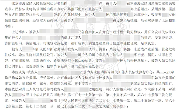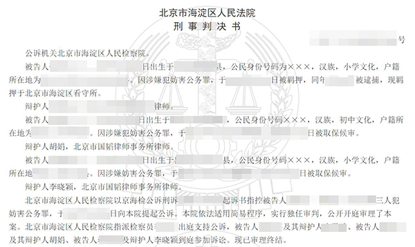 张某、李某、王某因为袭警涉嫌妨害公务罪被刑事拘留,羁押在北京市海淀区看守所。李某、王某委托了北京市国韬律师事务所律师胡娟、李晓颖作为辩护人,被取保并判处缓刑,同案张某被判处有期徒刑六个月。注:为保护案件当事人的个人隐私及涉及国家机密案件、有伤社会风化及其它不宜公开的案件,我们特对案件当事人的姓名、籍贯、住址、单位名称等做了隐藏技术处理,并只公布了判决文书的首页(显示李在珂律师团队律师是本案辩护律师)、尾页(显示判决结果),以证明李在珂律师团队所辩护的成功案例的真实性!特此说明!
