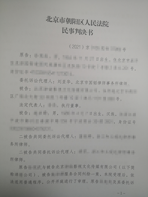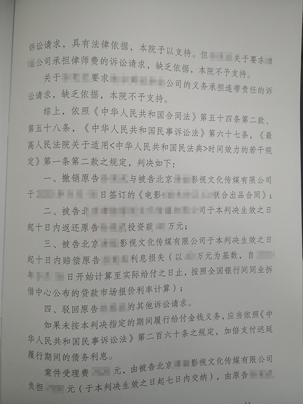 孙某因听说投资电影能赚钱,与一家公司签订合同,投资了某电影,结果电影一直都没有上映。经北京市国韬律师事务所刘亚华律师提供法律帮助,北京市朝阳区人民法院判决撤销合同,退回所有本金,并支付占用期间利息。注:为保护案件当事人的个人隐私及涉及国家机密案件、有伤社会风化及其它不宜公开的案件,我们特对案件当事人的姓名、籍贯、住址、单位名称等做了隐藏技术处理,并只公布了判决文书的首页(显示国韬律师团队律师是本案辩护律师)、尾页(显示判决结果),以证明国韬律师团队律师辩护的成功案例的真实性!特此说明!