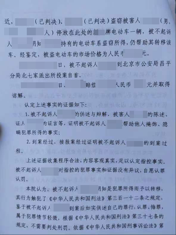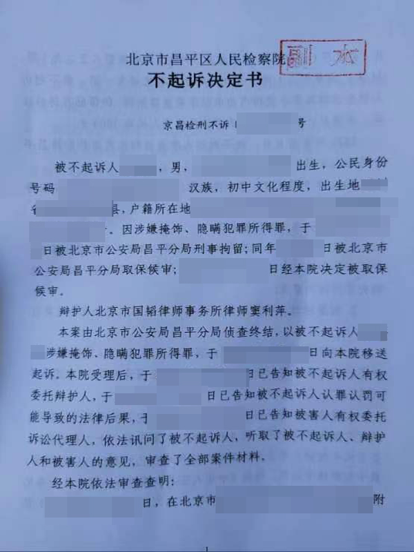 李某因配合转移盗窃的电动车,涉嫌掩饰隐瞒所得罪被北京市公安局昌平分局刑事拘留,经北京市国韬律师事务所李在珂律师团队窦利萍律师提供法律帮助,被取保候审,并且后续昌平检察院采纳了律师提交的不予起诉的法律意见,昌平区人民检察院决定不起诉处理。注:为保护案件当事人的个人隐私及涉及国家机密案件、有伤社会风化及其它不宜公开的案件,我们特对案件当事人的姓名、籍贯、住址、单位名称等做了隐藏技术处理,并只公布了判决文书的首页(显示李在珂律师团队律师是本案辩护律师)、尾页(显示判决结果),以证明李在珂律师团队律师律师所辩护的成功案例的真实性!特此说明!
