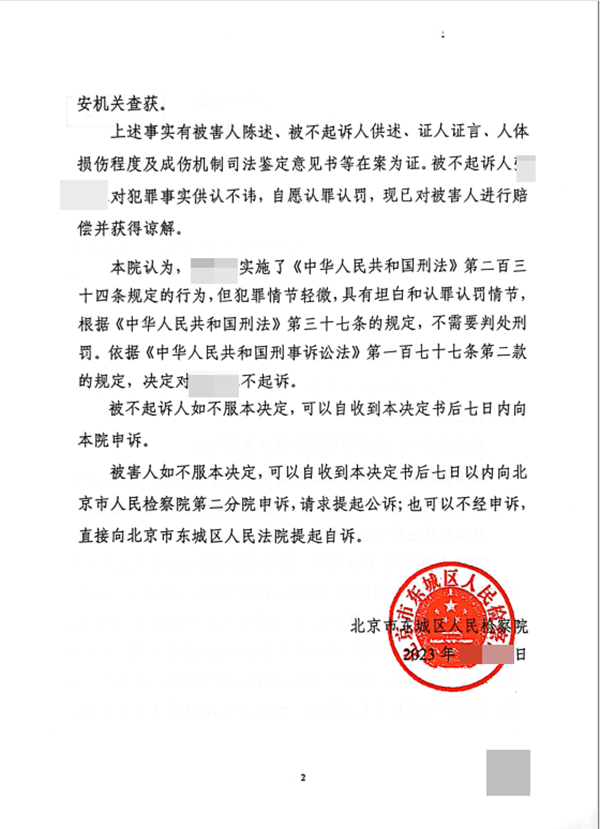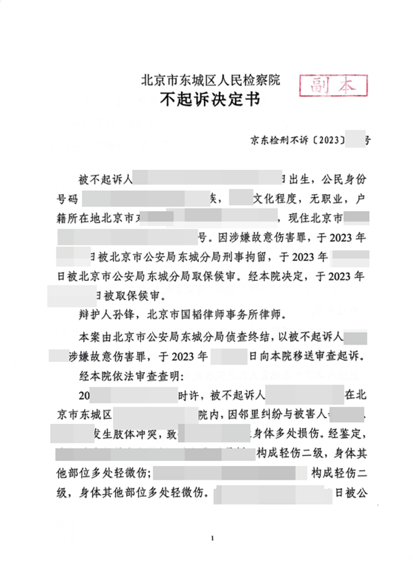 张某因和邻居发生冲突,导致两名邻居轻伤,涉嫌故意伤害罪被北京市公安局朝阳分局刑事拘留,刑拘后家属委托北京市国韬律师事务所介入,经李在珂律师团队孙锋律师提供法律帮助,成功取保候审,并且后续朝阳检察院采纳了律师提交的不予起诉的法律意见,决定不起诉处理。注:为保护案件当事人的个人隐私及涉及国家机密案件、有伤社会风化及其它不宜公开的案件,我们特对案件当事人的姓名、籍贯、住址、单位名称等做了隐藏技术处理,并只公布了判决文书的首页(显示李在珂律师团队律师是本案辩护律师)、尾页(显示判决结果),以证明李在珂律师团队律师律师所辩护的成功案例的真实性!特此说明!