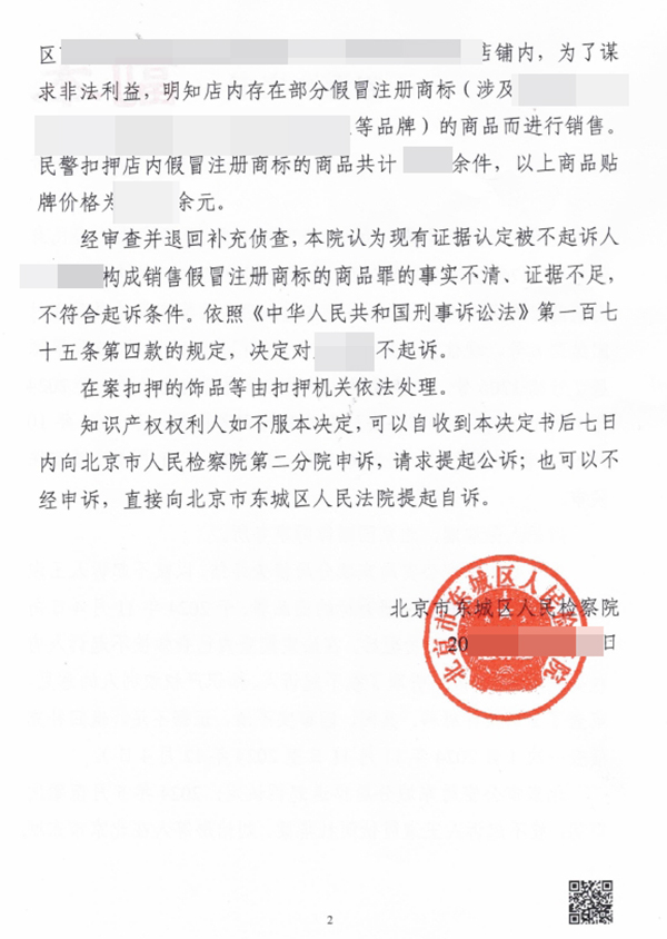 许某是一家公司的员工,因为涉嫌销售假冒注册商标的商品罪被北京市公安局东城分局刑事拘留,刑拘后家属委托北京市国韬律师事务所介入,经李在珂律师团队张旭瑞律师提供法律帮助,成功取保候审,并且后续东城检察院采纳了律师提交的不予起诉的法律意见,决定不起诉处理。注:为保护案件当事人的个人隐私及涉及国家机密案件、有伤社会风化及其它不宜公开的案件,我们特对案件当事人的姓名、籍贯、住址、单位名称等做了隐藏技术处理,并只公布了判决文书的首页(显示李在珂律师团队律师是本案辩护律师)、尾页(显示判决结果),以证明李在珂律师团队律师律师所辩护的成功案例的真实性!特此说明!